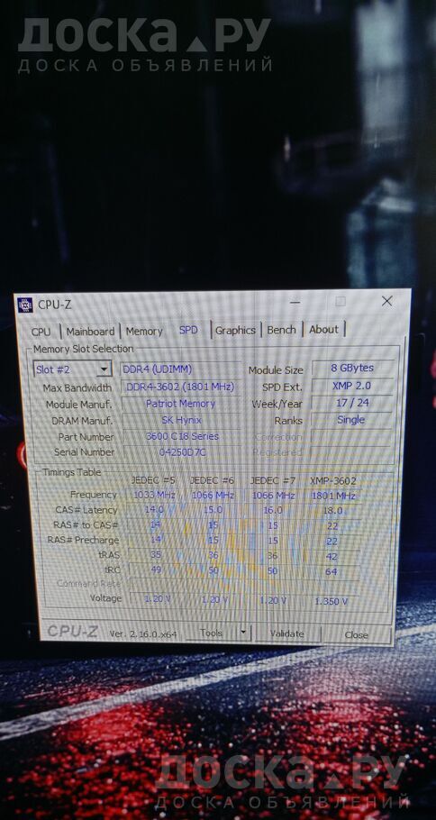 - Оперативная память Patriot Viper DDR4 2х8 Gb, работает на частоте 3600 мегагерц, с таймингами 18 - 22 - 22 - 52 CR2, задержка 57, 1ns, чтение 52967, запись 51465, копирование 50038 мб/сек ( Aida 64 memtest) ( на гарантии)