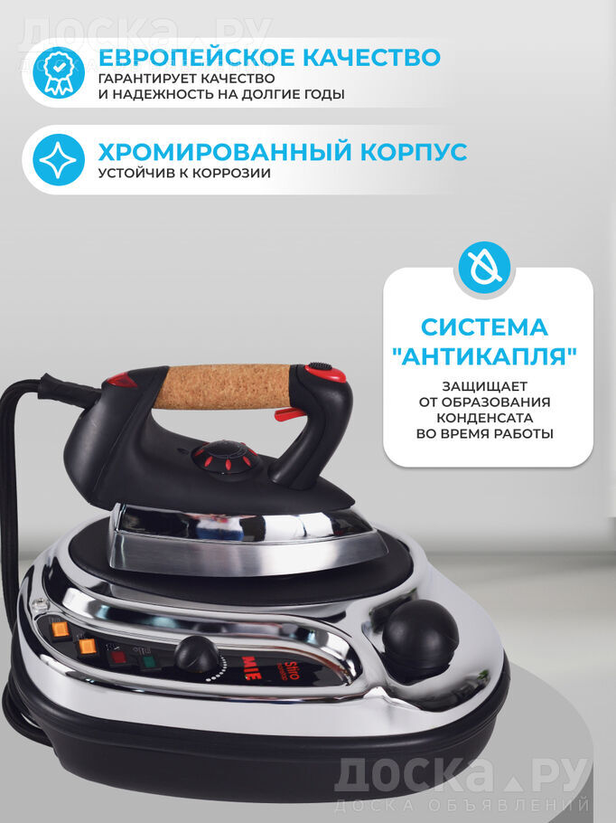 Профессиональный утюг оснащён пробковой ручкой, которая очень удобно ложится в ладони и не скользит, а также толстой подошвой из высокопрочного алюминиевого сплава;