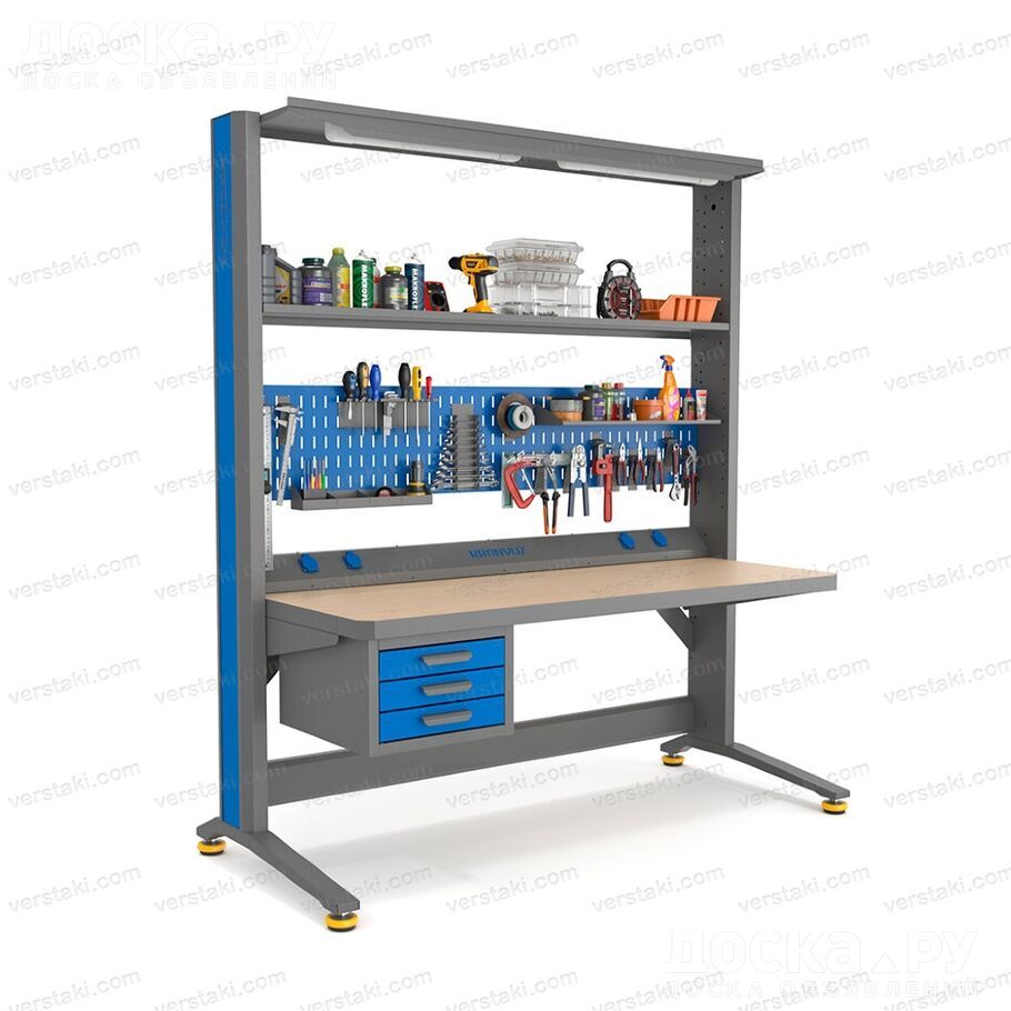 Рабочее место мастера участка Kronvuz Pro WP 1300-Lsr предназначено для выполнения работ по ремонту, проверке и обслуживанию различного технического оборудования. усиленная конструкция позволяет размещать весь необходимый инструмент на предусмотренных полках, панелях, а также в установленной навесной тумбе; ящики стола оснащены надежными направляющими, способными выдерживать большие нагрузки; перфорированный экран в сочетании с размещенными лотками, держателями и всевозможными креплениями дает возможность упорядочить пространство согласно своим предпочтениям. Цена - 80 300 руб.