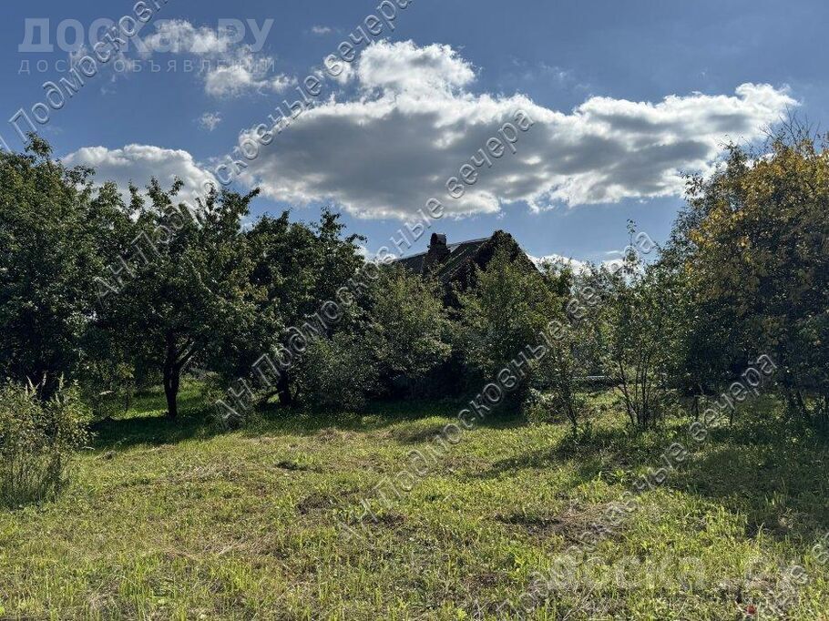 На участке садовые деревья, кустарники, красивый яблоневый сад, участок огорожен.