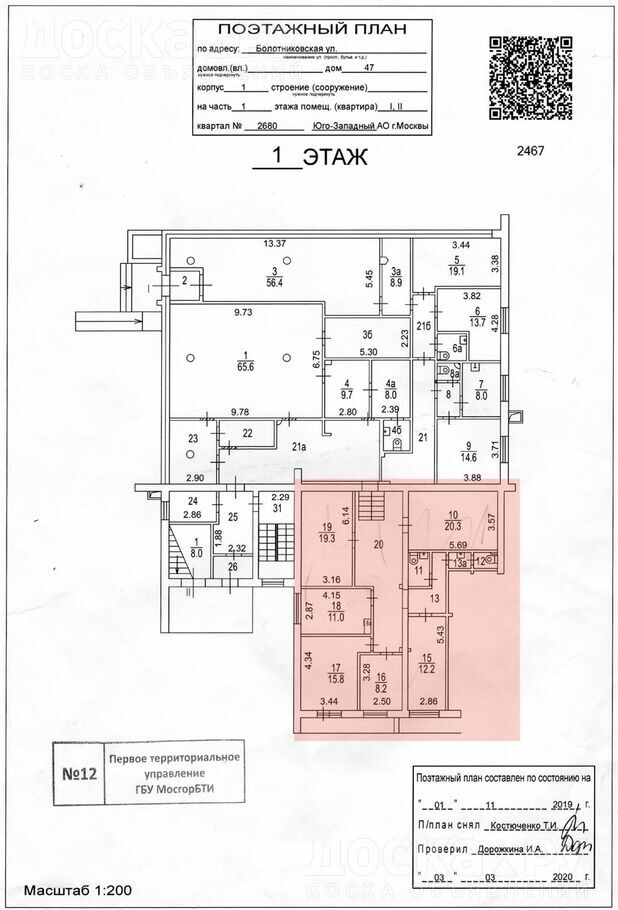 Сдается помещение по адресу: г. Москва, ул. Болотниковская д. 47, корп. 1, общая площадь – 121, 5 кв. м. Вся площадь на первом этаже. Вход через торговый зал магазина Магнит, который работает круглосуточно. Предлагаемая площадь выделена красным на плане. Возможна аренда частями от 20 кв. м. под офис, склад, салон красоты, стоимость – 2300 рублей за кв. м. , если целиком вся площадь 240 тысяч рублей в месяц. Тел. 89036109171