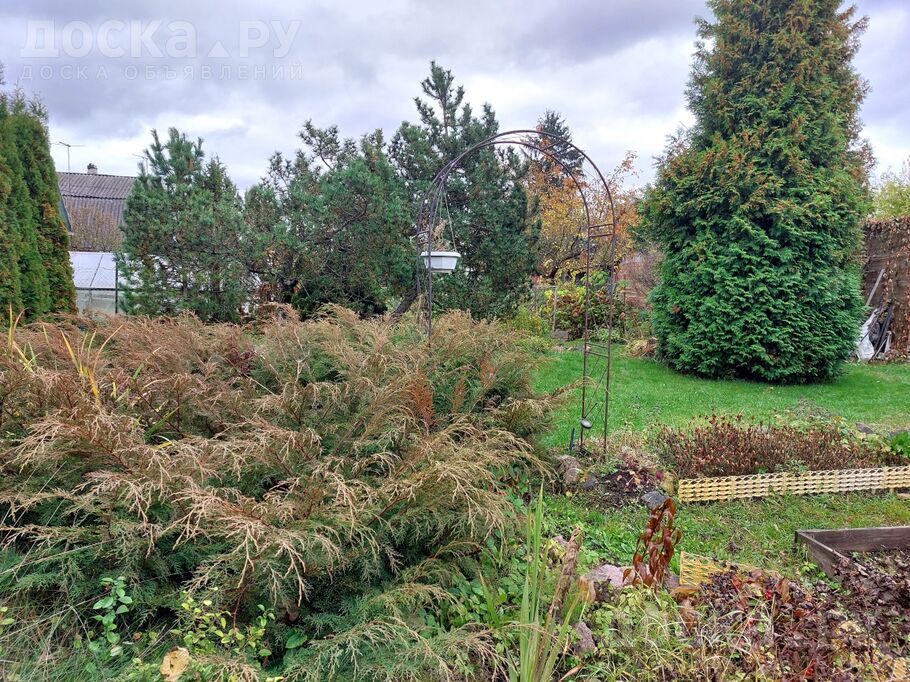 Участок ровный, прямоугольной формы. Разработанный и ухоженный. Растёт всё. Есть 3 яблони; вишня, крыжовник, кусты смородины (белой, красной, черной); куст жимолости; малина, клубника и даже виноград. Много хвойных кустарников, в т. ч. кедр, ели. Есть грядки, посадки. И конечно же цветы. )).