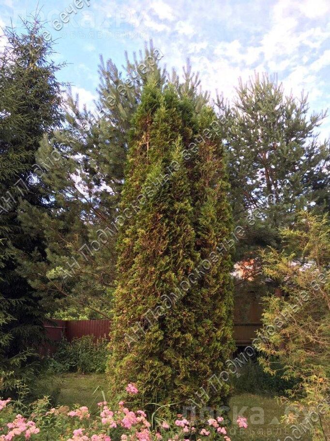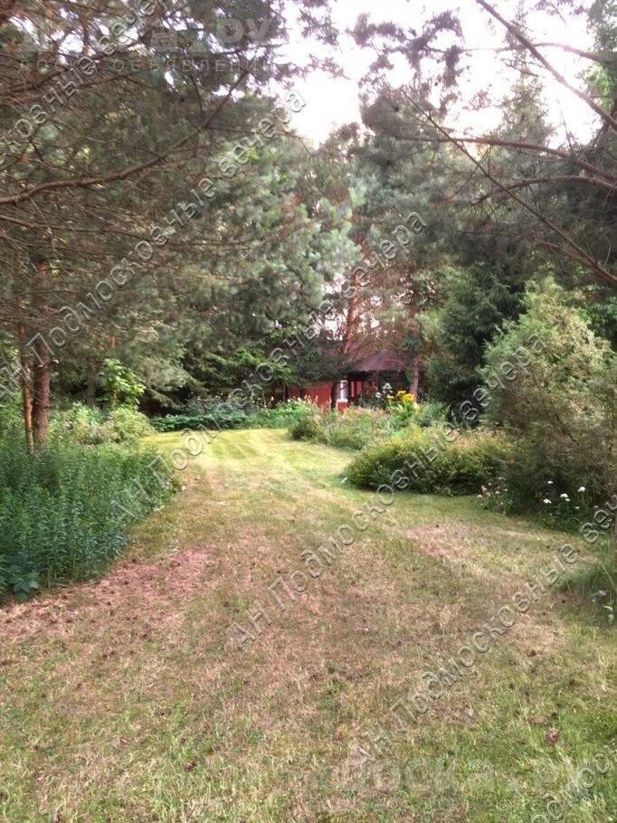 На участке лесные и садовые деревья, кустарники, газон, дорожки, стоянка, участок огорожен (металлопрофиль).