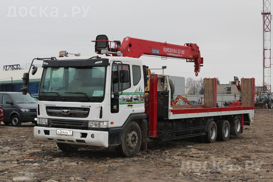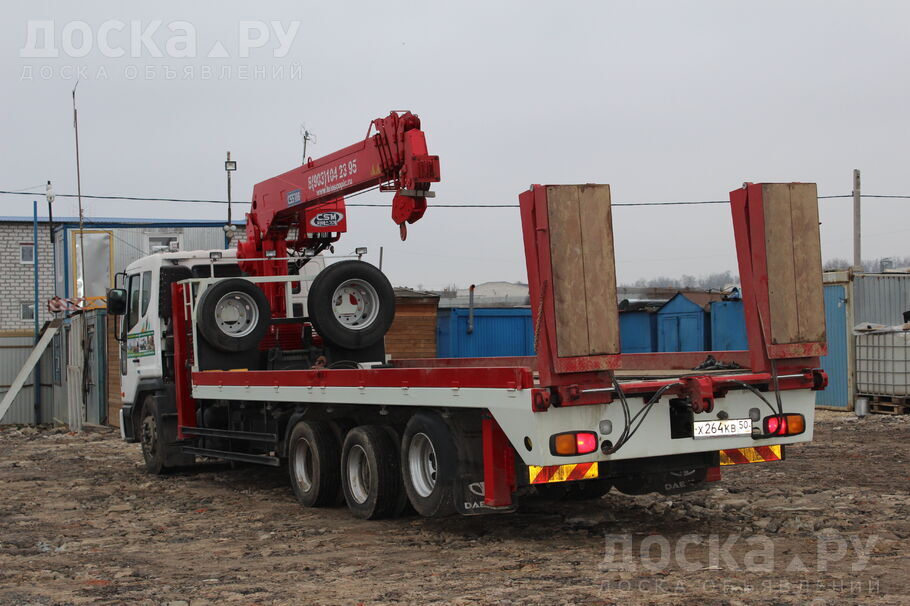 Эвакуатор – низкорамник Дэу с манипулятором, лебедкой и люлькой. Для перевозки спецтехники, вагончиков, контейнеров, оборудования и т. д. , г/п платформы 15 тонн, г/п стрелы 7, 5 тонн