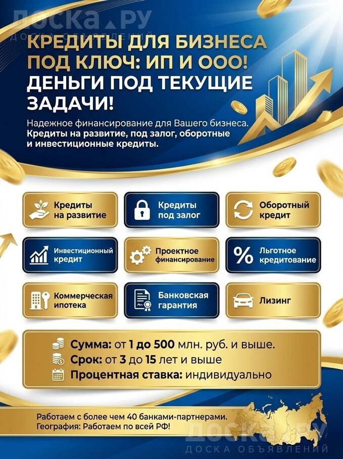 Оказываем содействие, помощь в получении кредита на Ваши планы и цели, одабриваем кредиты на поддержку и развитие Вашего бизнеса. Работаем с физическими и юридическими лицами, оказываем полное сопровождение. Сотрудничаем с 40 крупными банками.