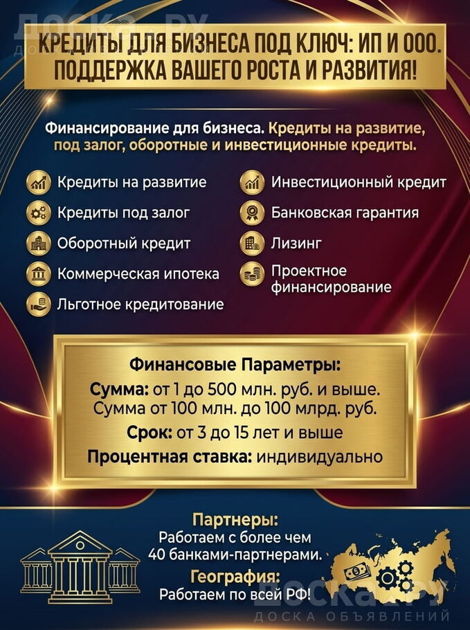Оказываем помощь и поддержку в получении кредита на Ваши планы и цели, одабриваем кредиты на развитие Вашего бизнеса. Работаем с физическими и юридическими лицами, оказываем полное сопровождение. Сотрудничаем с 40 крупными банками.